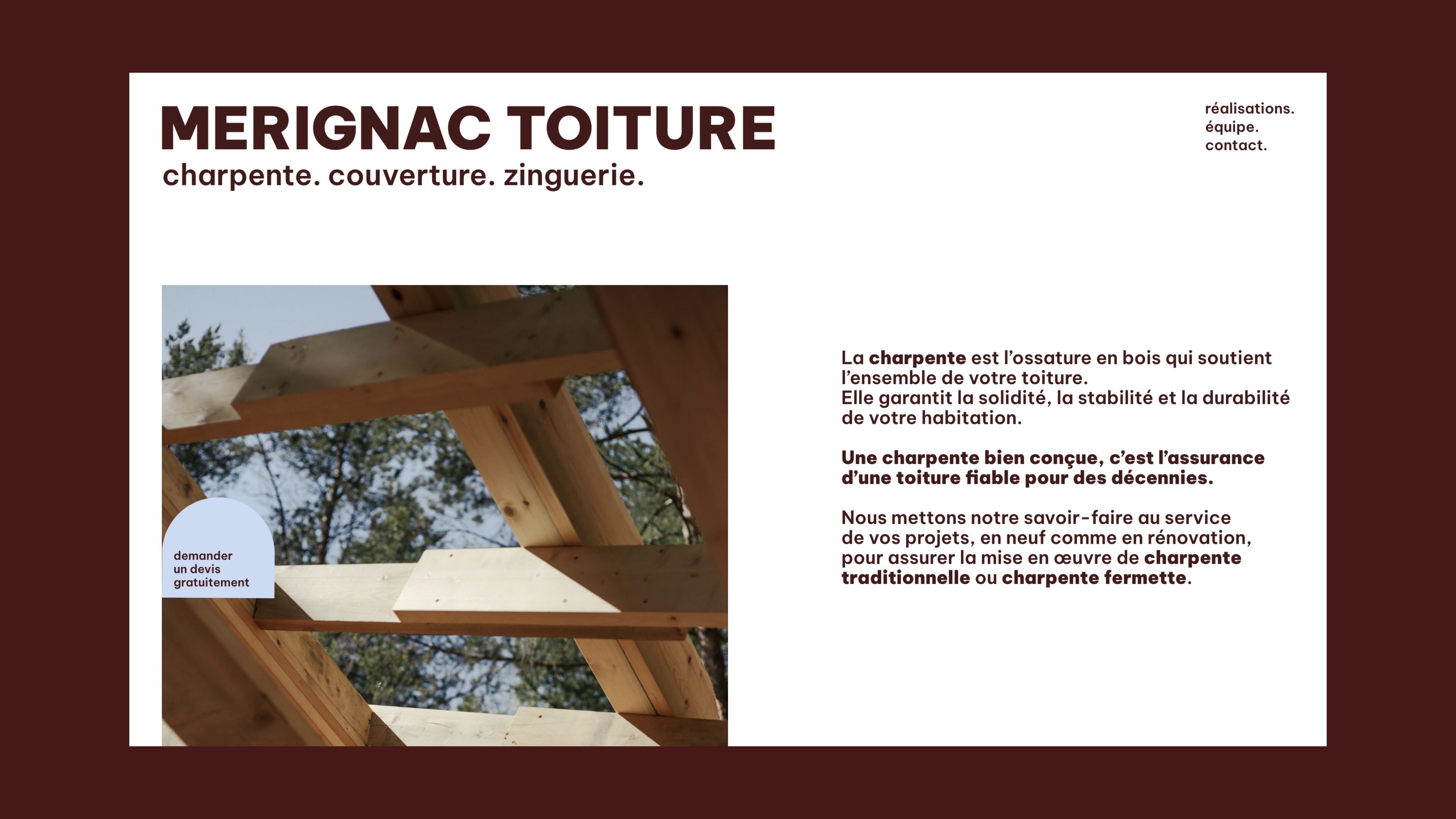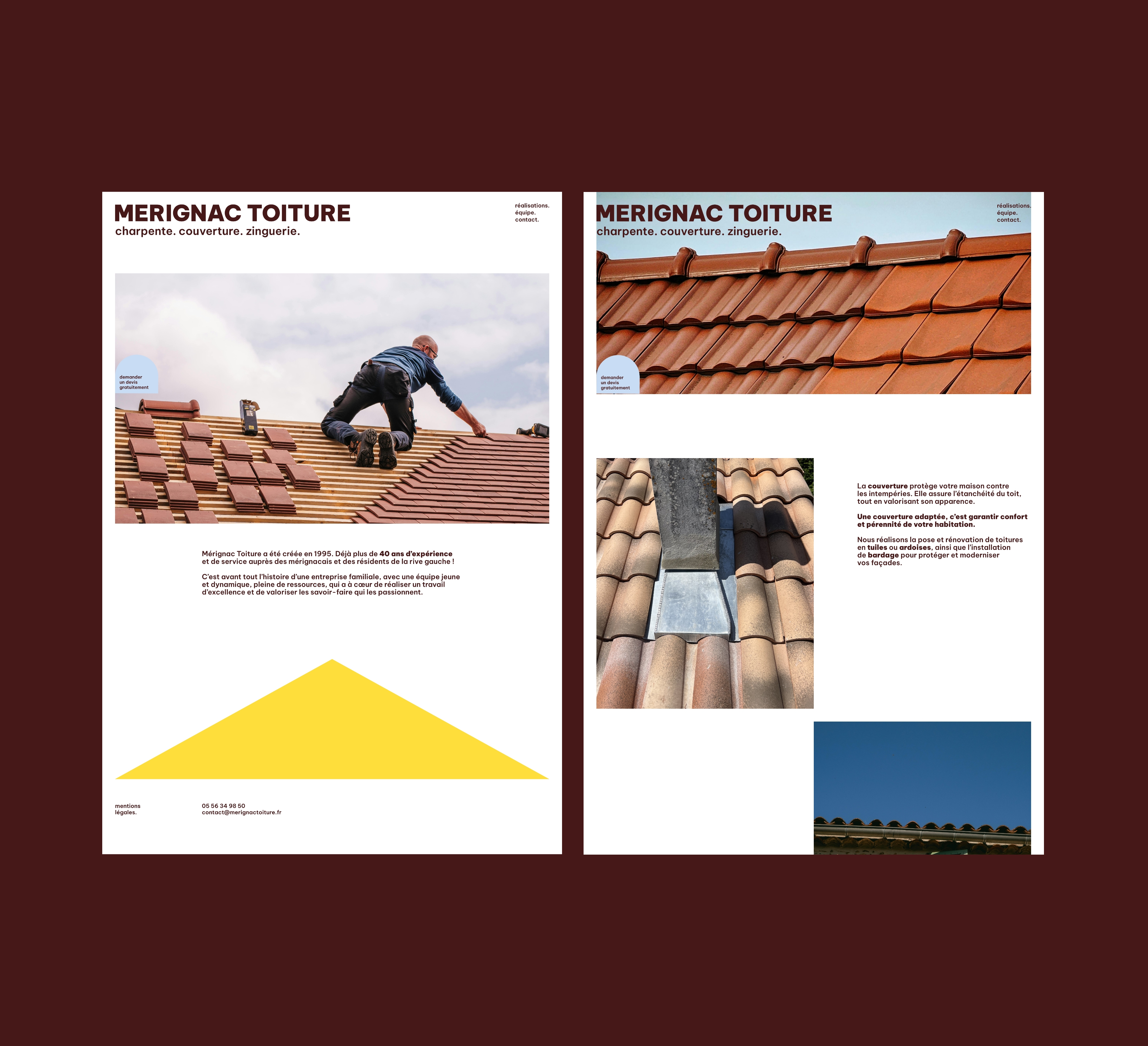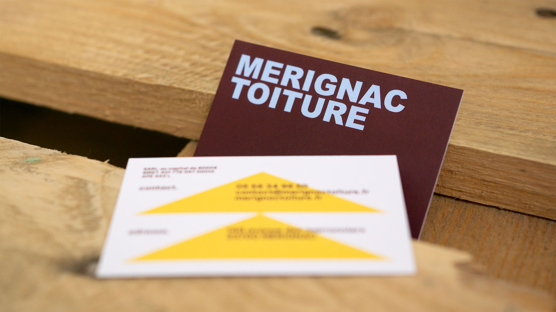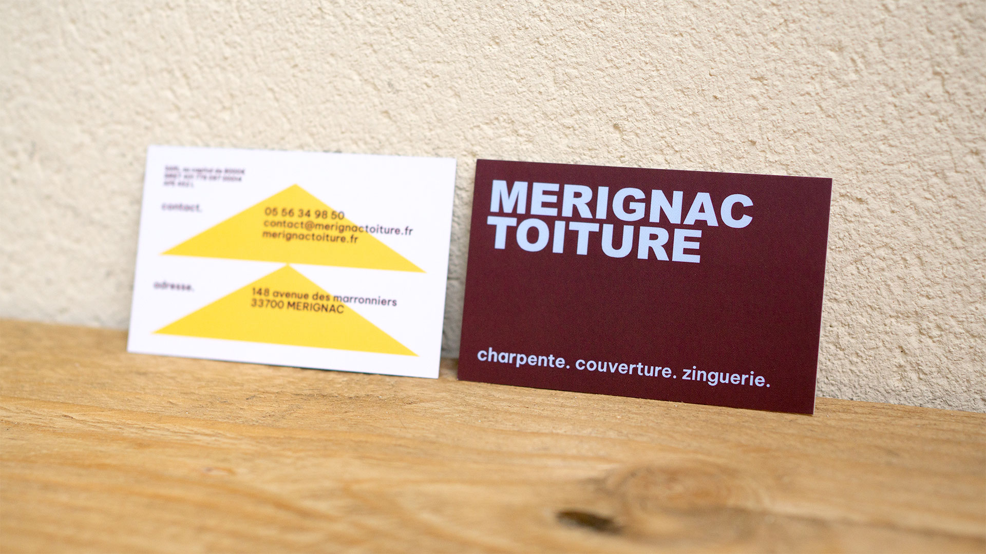 Le triangle et l’inscription « MERIGNAC TOITURE », emblématique de l'entreprise, existent désormais de manière autonome, et se jouent de l’espace.
