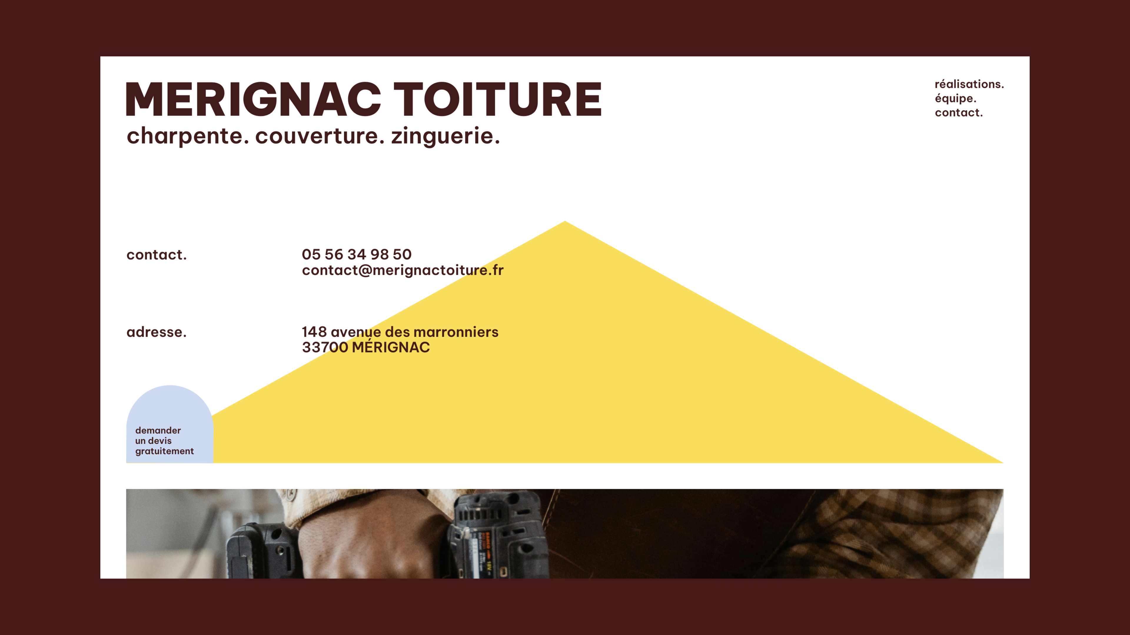 Le triangle et l’inscription « MERIGNAC TOITURE », emblématique de l'entreprise, existent désormais de manière autonome, et se jouent de l’espace.